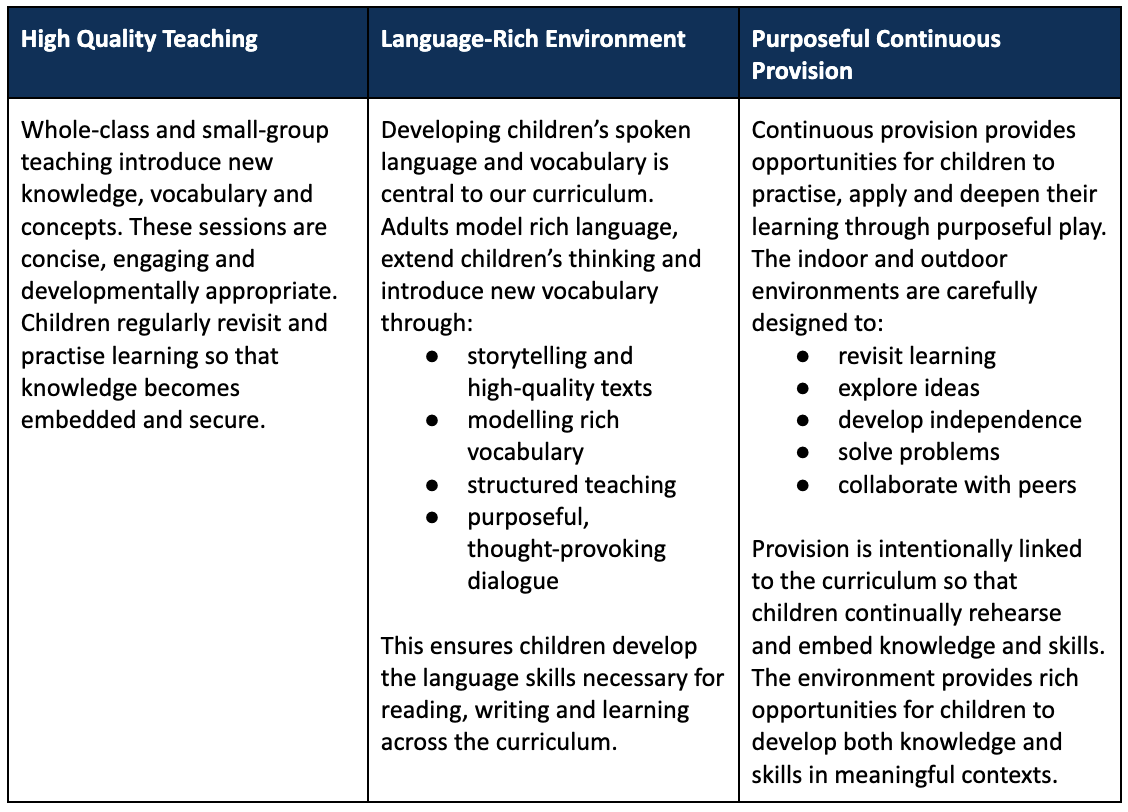 The Early Years curriculum provides the foundations for future success by prioritising: